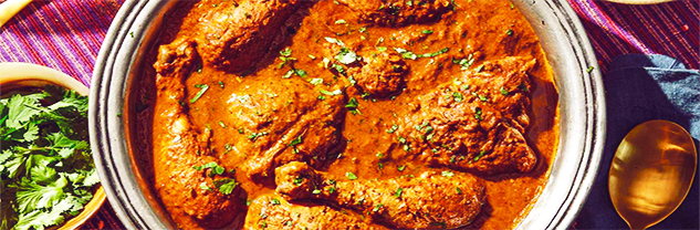 crispy, golden, and tender bone-in chicken pieces and an array of vegetables, all simmered in a fragrant and creamy coconut curry sauce. saffron butter rice and a drizzle of fresh cream for garnish